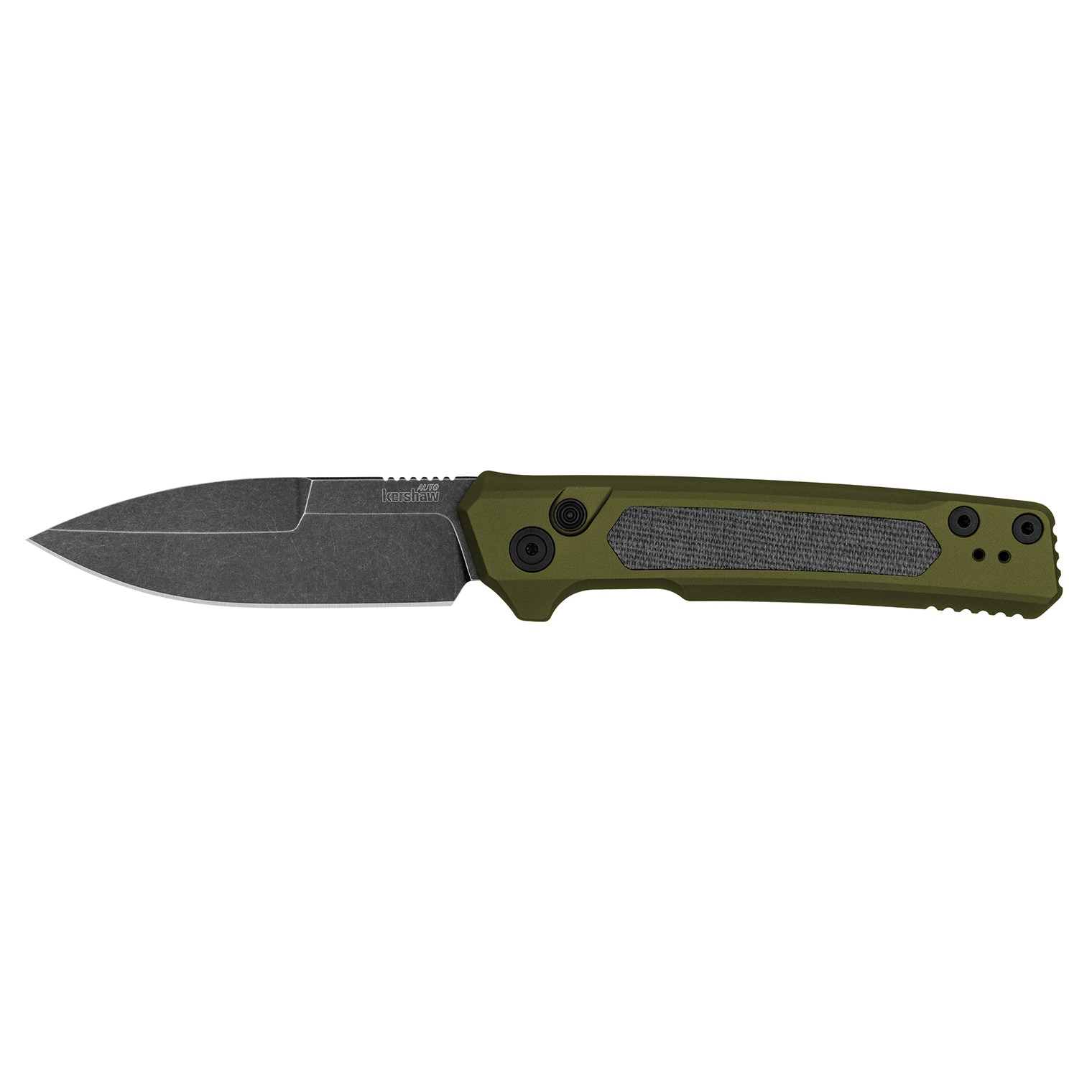 The Launch 22 combines a spear point blade, enhanced with a wide flat grind and bayonet-inspired style, with an OD green anodized aluminum handle. MagnaCut steel in a Blackwash finish delivers performance and durability, while jimping on the spine adds control. Black canvas Micarta inserts on both handles boost grip and larger hardware emphasizes overbuilt construction. Opens with Kershaw automatic push of a button.
