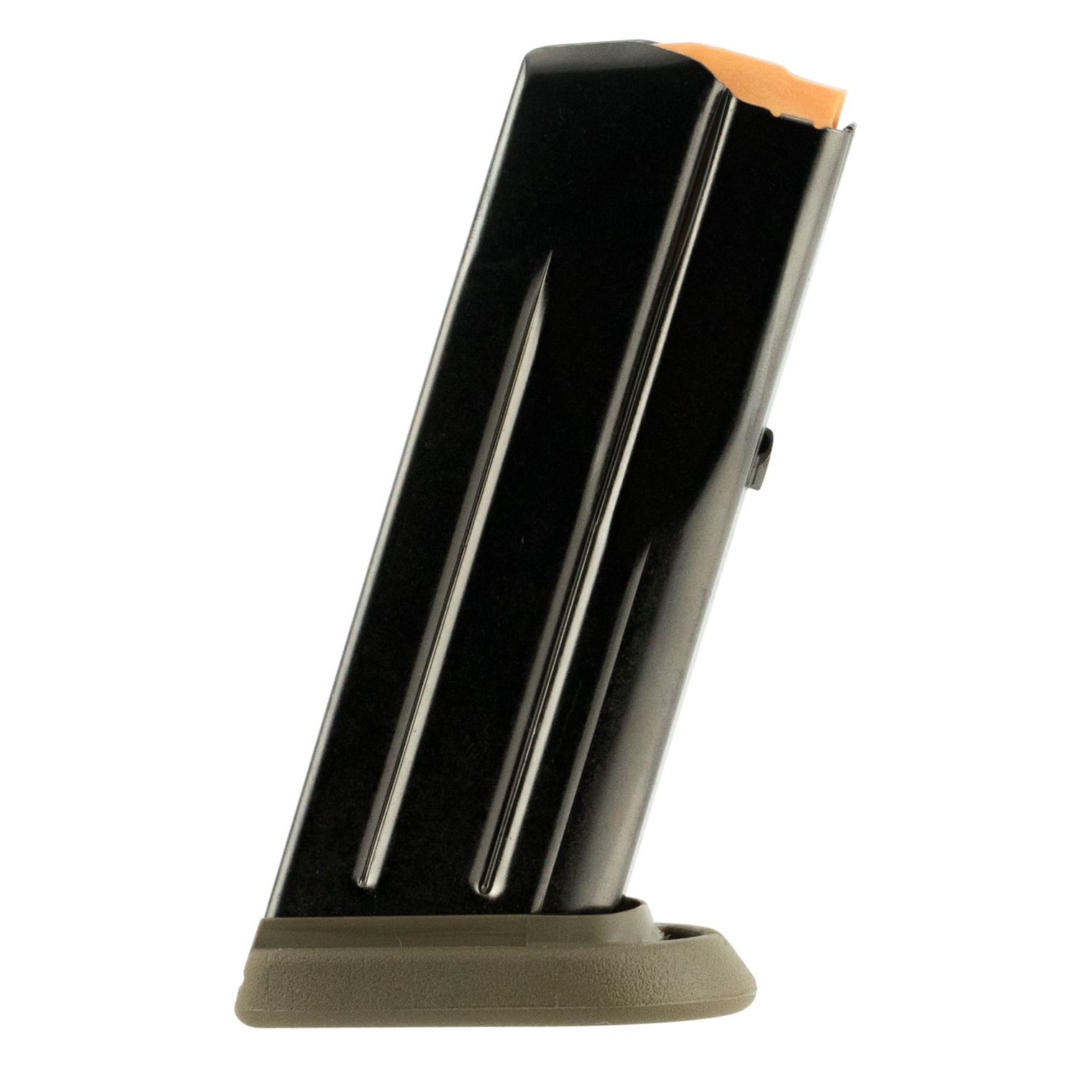 This magazine is compatible with your FN FNS Compact. It features a polished, darkened steel body with low-friction follower and flat dark earth base pad.