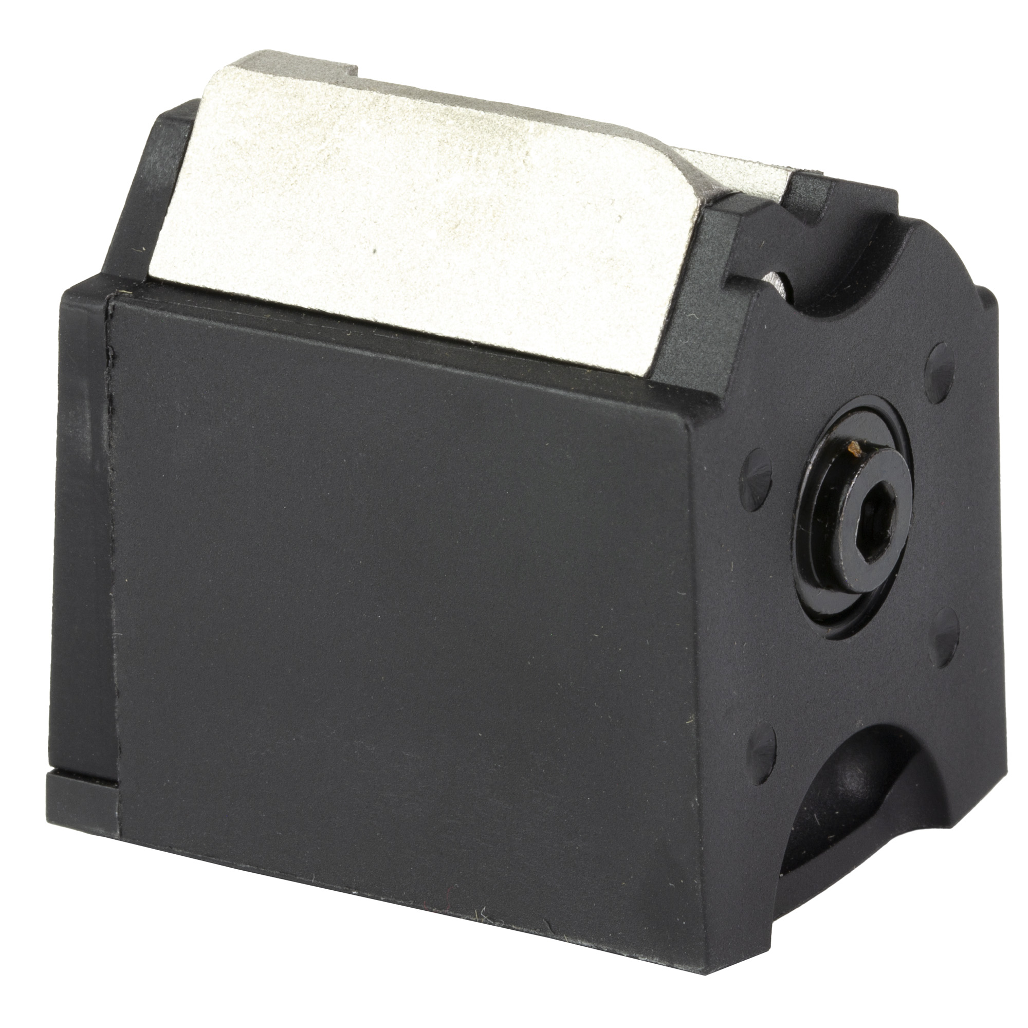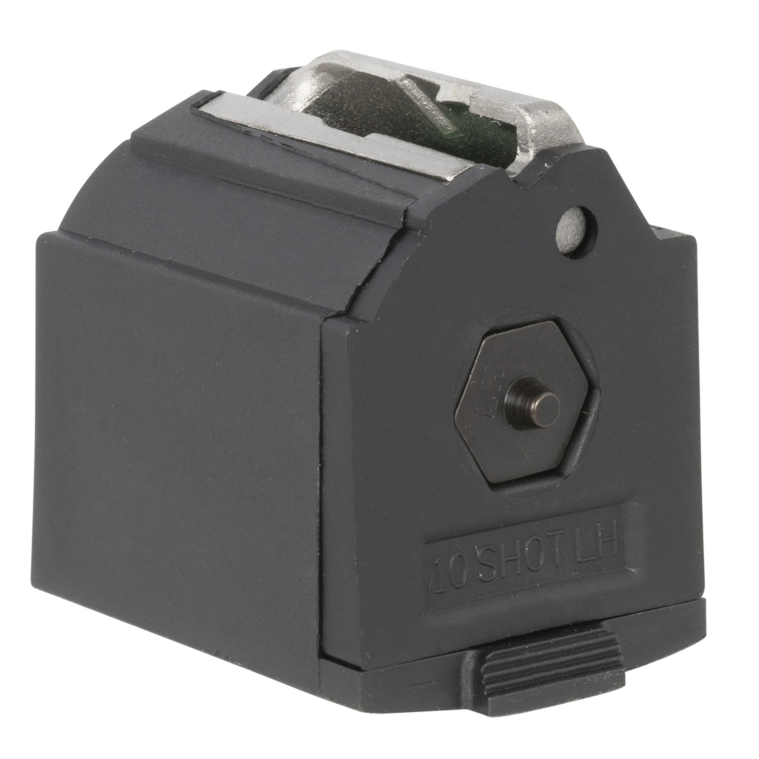 The BLX-1 Left-Hand magazine is made of black plastic with steel feed. It works with any factory original 10/22 Rifle with left-hand feed and ejection only.