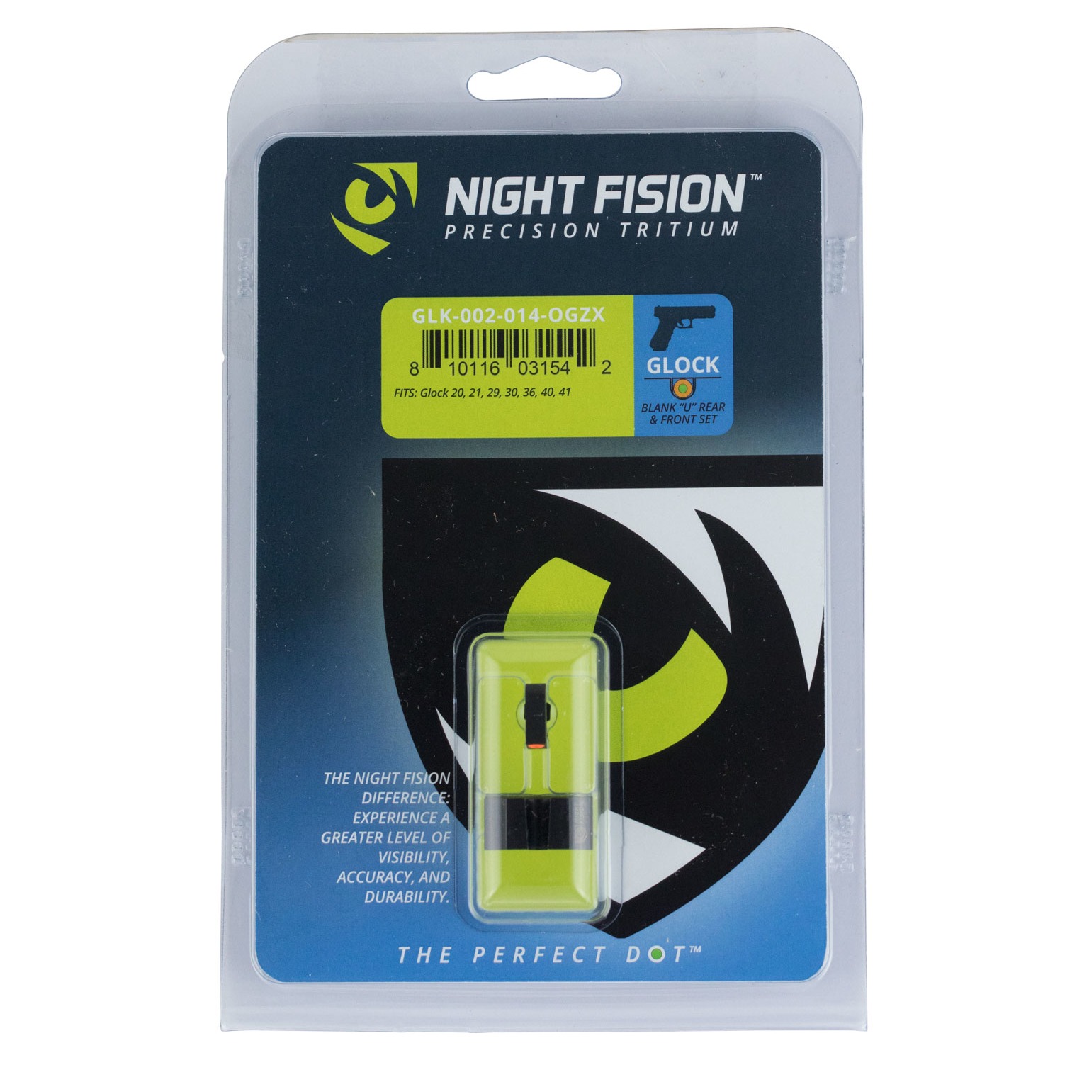 When it comes to tritium gun sights, aluminum sleeves and painted-on white rings are the norm. Night Fision breaks the mold, literally. Our patented, injection molded sleeve design not only holds our tritium vials securely in place, it creates a brighter and more durable ring, we call The Perfect Dot, that provides maximum visibility both day and night. On our Glow Dome front sights, the ring carries phosphorescent material aiding in a front sight that aids visibility while your eyesight adjust to dark light. Front Sight Width: 0.14”. Front Sight Height: 0.213”. Rear Sight Height: 0.272”. Fits: Glock models 20/21/29/30/36/40/41, including S and SF variants.