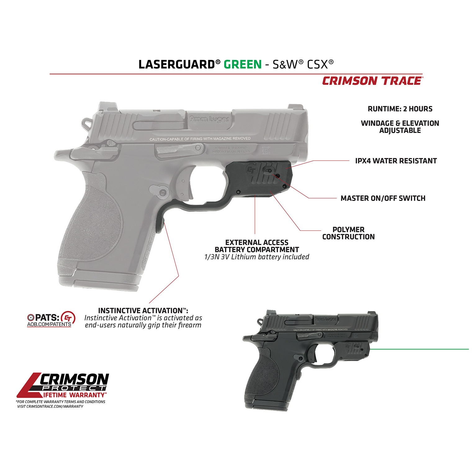 Laserguard is the trusted household name for comprehensive laser sighting systems. Featuring the Crimson Trace patented Instinctive Activation technology, the laser turns on when you naturally grip your pistol; no need for manual ON/OFF buttons. Each Laserguard is designed to look like it is part of the firearms. Laserguards mount quickly and securely around the pistol’s trigger guard, enhancing your ability to engage threats quickly and accurately. *Fits S&W CSX