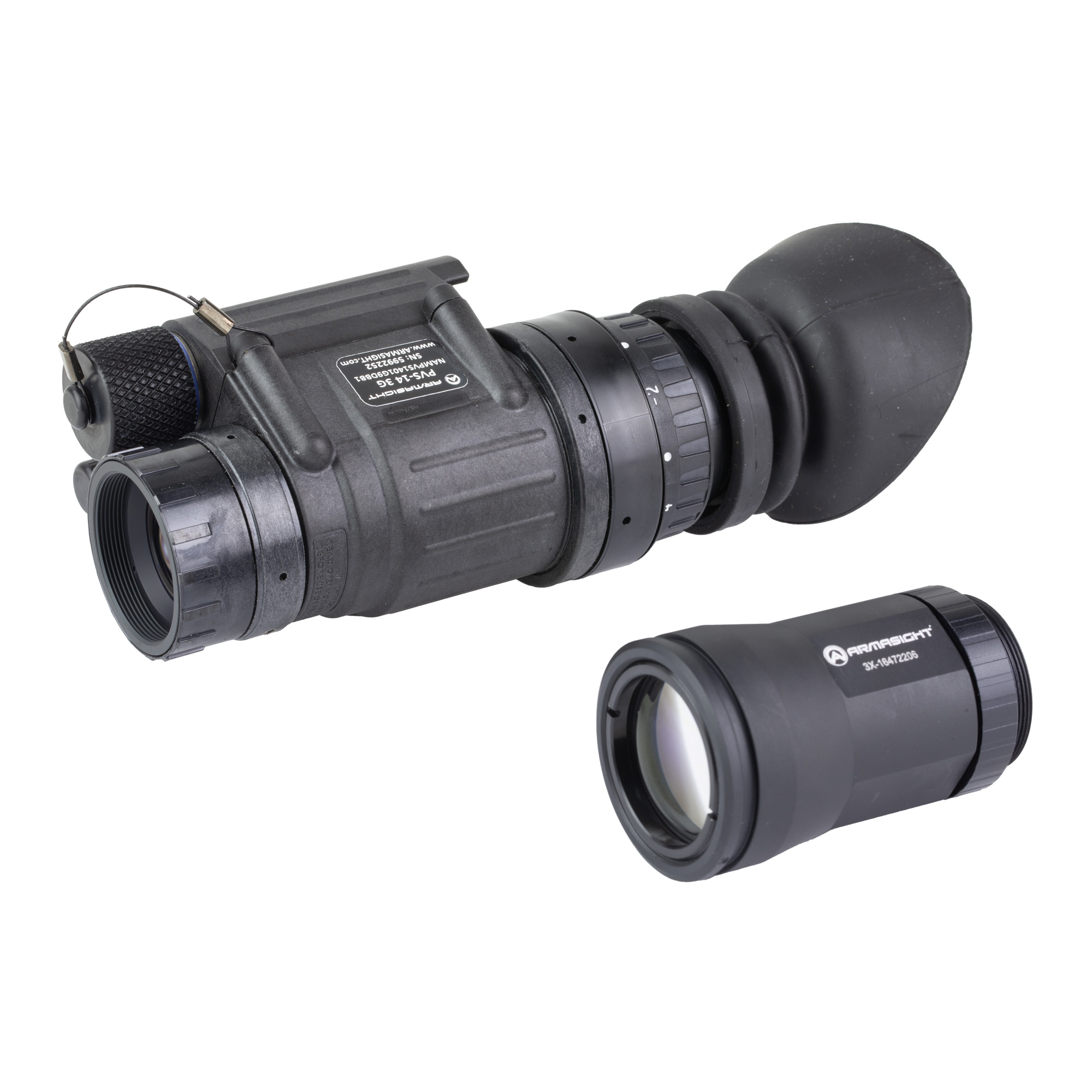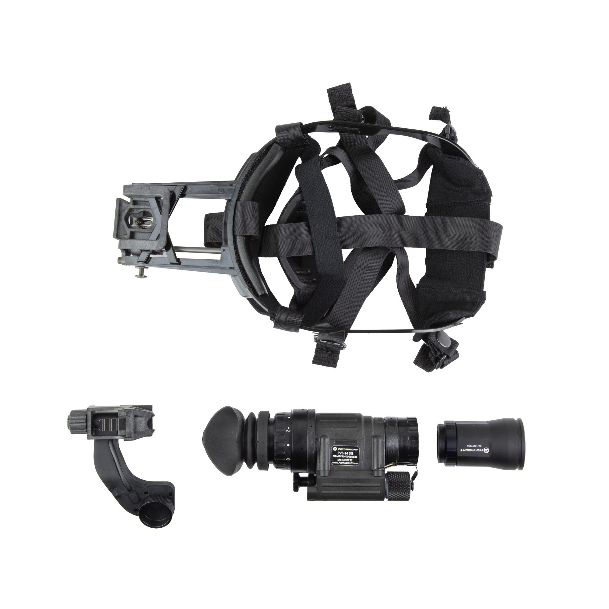 Armasight, PVS-14 Gen 3 White Phosphor, Night Vision Monocle, Matte Finish, Black, 1800+ FOM Elbit YH IIT, Manual Gain, 3x Magnifier Lens, Sacrificial Window, J-Arm Mount, Skullcrusher Head Mount Assembly, Soft Carrying Case