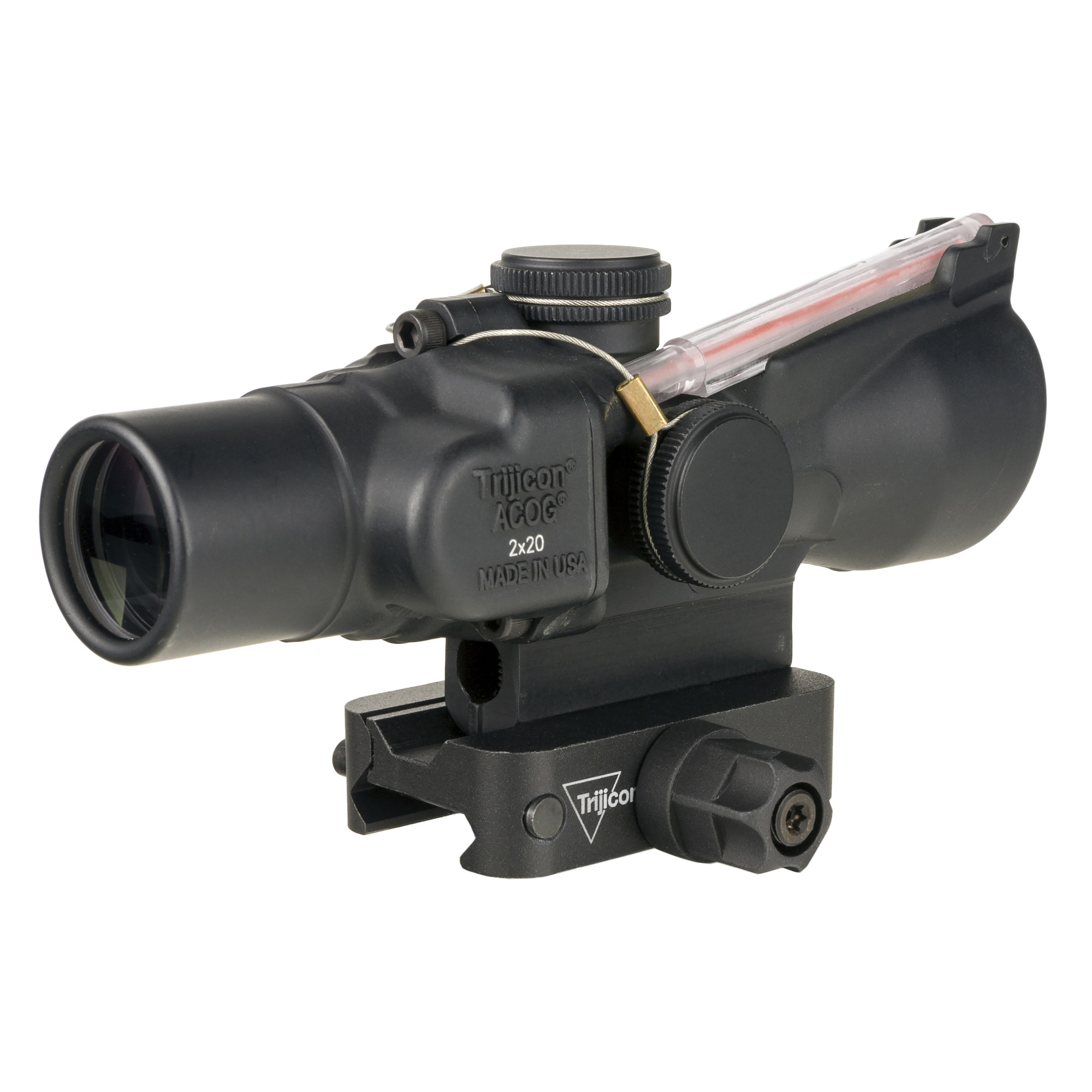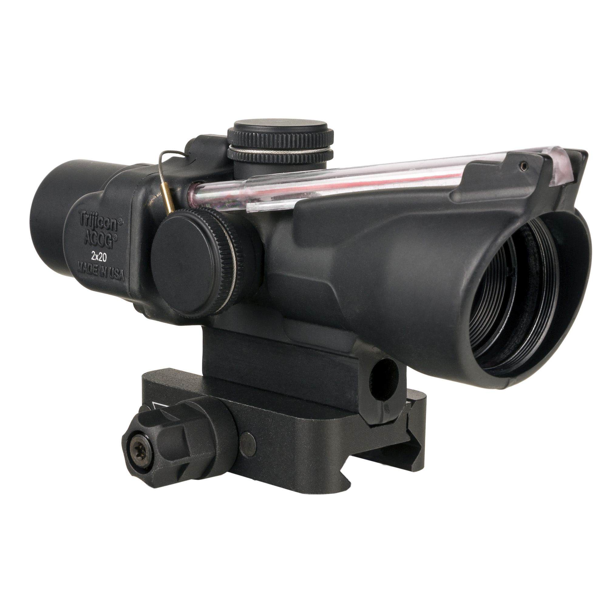 The Trijicon ACOG 2x20 riflescope is well-suited to firearms with limited space like UZI H&K or MP-5 9mm submachine guns. With a step-up in fixed magnification this illuminated reticle riflescope increases target detection distance in any lighting conditions. - The Trijicon Compact ACOG Mount w/ Q-LOC Technology features a Mil-Spec drop test rated 6061-T6 aluminum design with an easy to use one handed tool less mounting system. The spring-loaded design allows for constant retention and maintaining of zero even if the knobs are not tightened. - The mount boasts a low weight and low profile design with superior return to zero performance and is compatible with any Mil-Spec or NATO Picatinny rail. - Matte black anodized finish - Made in the USA - Length x Width x Height: 5.3 in x 2.1 in x 2.6 in (134.62mm x 53.34mm x 66.04mm) - Weight: 8.5 oz. (240.97g) - Magnification: 2x - Objective Size: 20mm - Reticle Pattern: Rapid Target RTR - Day Reticle Color: Red - Night Reticle Color: Red - Bullet Drop Compensating (BDC): Yes - Caliber: 223 Rem / 55 gr. - Bindon Aiming Concept (BAC): Yes - Illumination Source: Fiber Optics & Tritium - Power Source: Fiber Optics & Tritium - Adjustment: 2 clicks per in. @100 yards - Exit Pupil: 0.39 in. (9.91mm) - Field of View (degrees): 5.6
